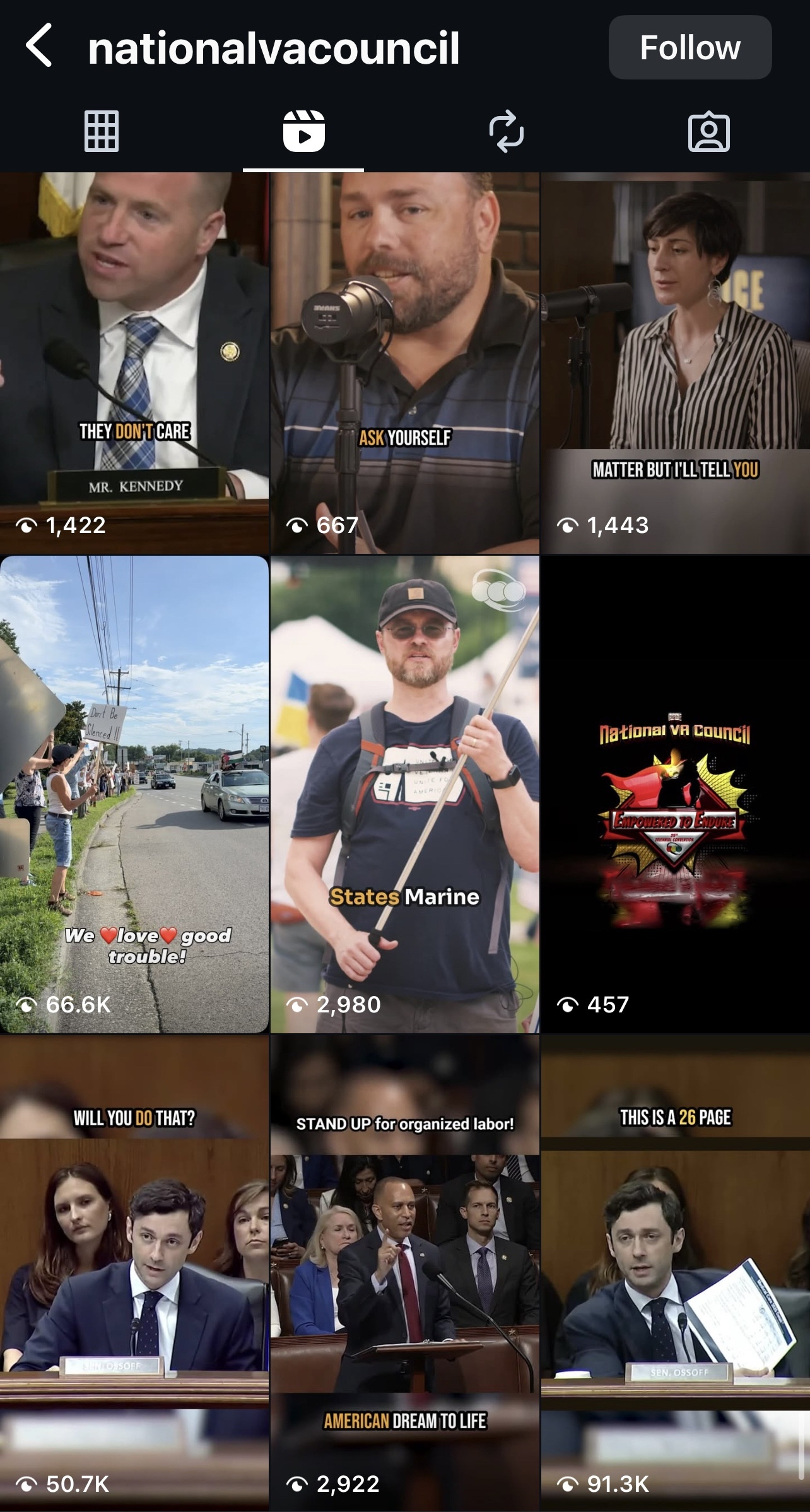 In less than four months, I was able to bring the National VA Council's Instagram following from approximately 800 to 3,000. I also created a series of videos in Adobe Premiere Pro that ended up getting millions of views. One video in particular has 1.4 million views as of August 2025.